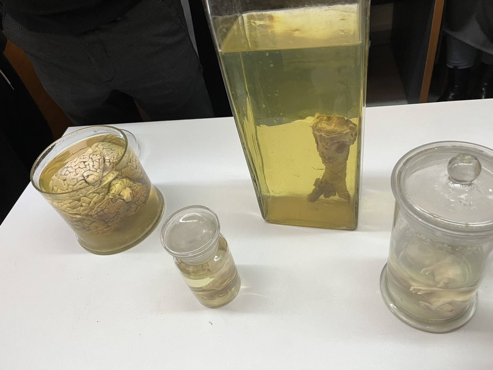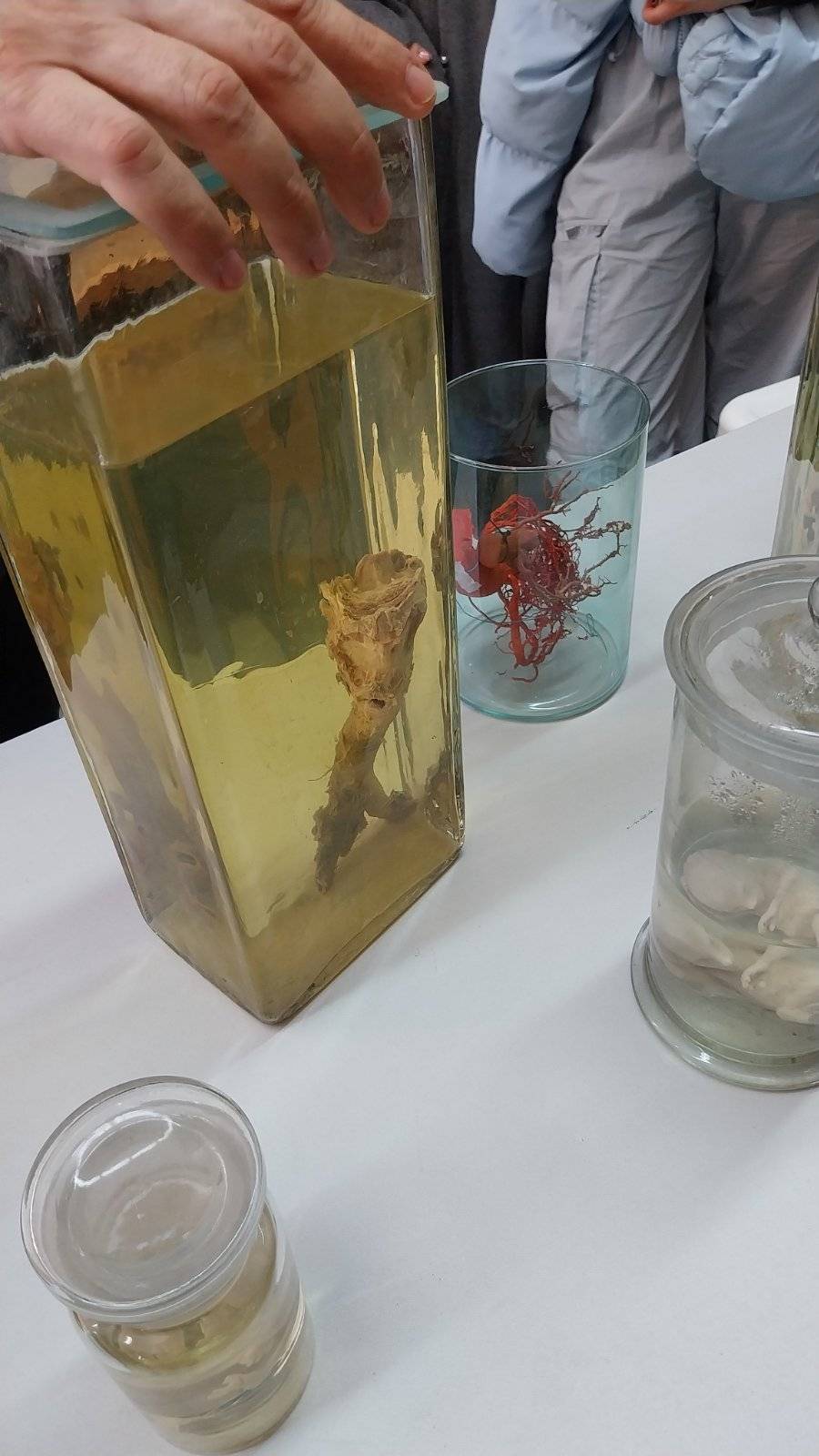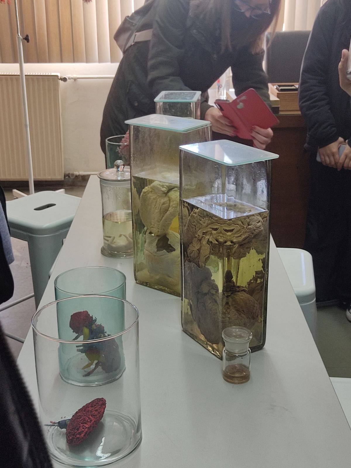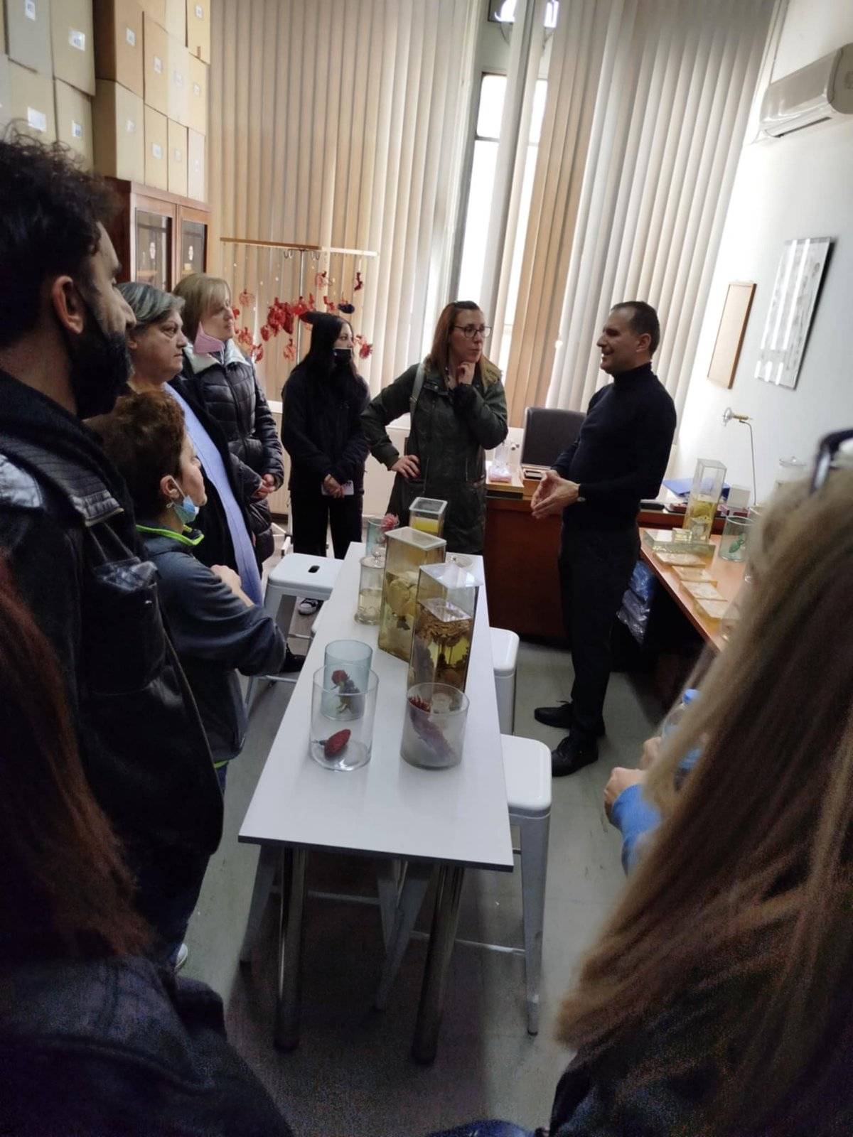Ο Διευθυντής του εργαστηρίου κ. Παρασκευάς, μετά από μια εξαιρετική ομιλία ανθρωπιστικού περιεχομένου, συνόδευσε τους μαθητές στο εργαστήριο Ωτορινολαρυγγολόγος, όπου οι φοιτητές της ειδικότητας εκπαιδεύονταν πάνω σε πραγματικά πτωματικά εκθέματα. Χειρουργούσαν δηλαδή με τη βοήθεια μικροσκοπίου το εσωτερικό αυτί! Οι μαθητές μας ενθουσιάστηκαν και εμπλουτίστηκε δια ζώσης, η εμπειρία τους στο μάθημα της ανατομίας. Μετά περιηγήθηκαν στο μουσείο διαφόρων οργάνων (εγκέφαλο, λάρυγγα, τραχεία, βρόγχοι κλπ) και αμβλωματικών εμβρύων. Είναι ανθρώπινα όργανα που σαν καλούπια, δέχθηκαν έκχυση ειδικής κόκκινης ΡΗΤΙΝΗΣ έτσι ώστε να αποτυπωθούν οι ανατομικές λεπτομέρειες του εσωτερικού του οργάνου (π.χ. καρδιάς).